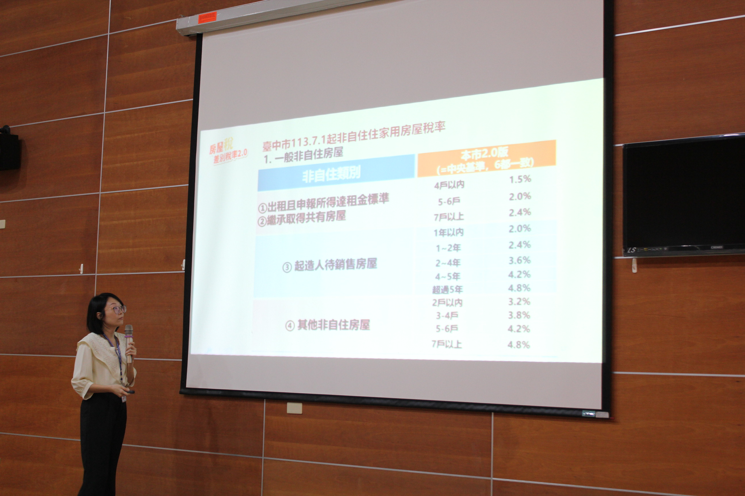 講師向志工們說明臺中市113年7月1日起非自住住家用稅率。