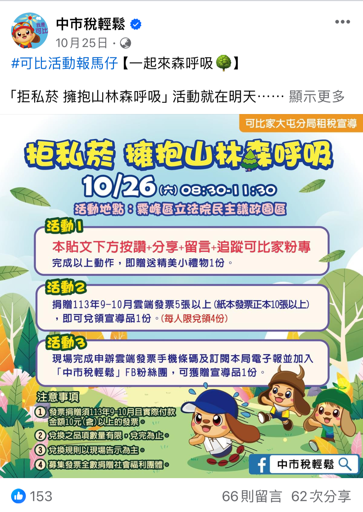活動當日臉書發布「按讚+留言+分享」送好禮活動,並推廣指定稅務影片,動動手指就能達成,民眾踴躍參與。