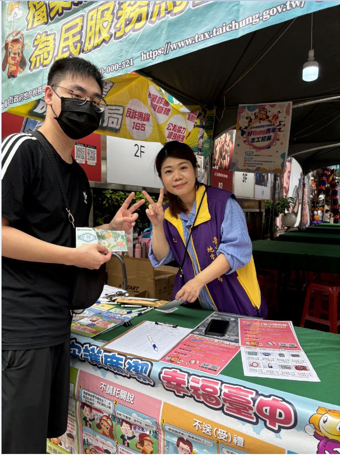 設置宣導服務台,提供與民眾互動之場地,懸掛布條宣導如何申請手機條碼及納稅者權利保護法,張貼海報宣傳性別平等等重要訊息。