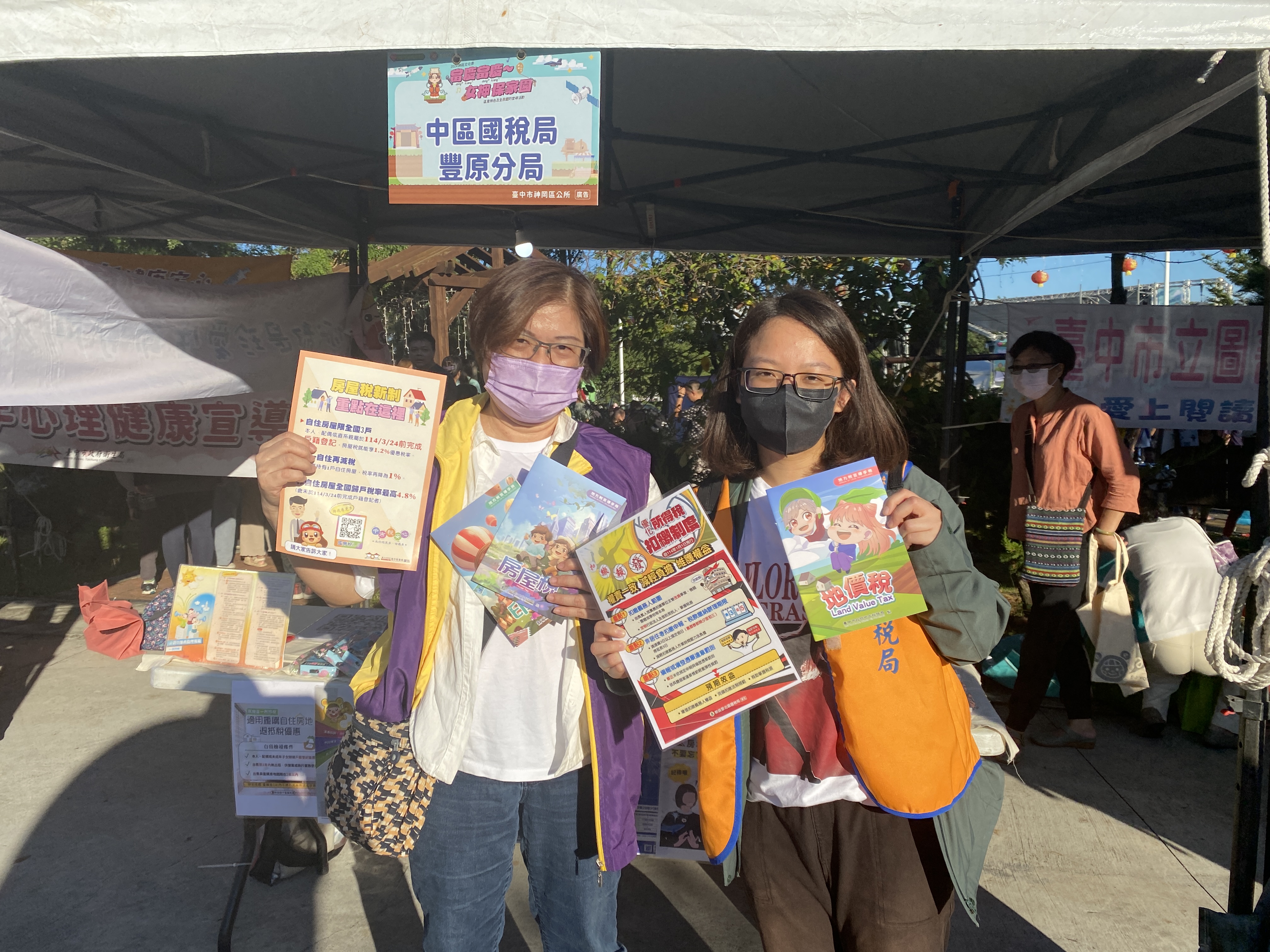 結合財政部中區國稅局豐原分局在國稅局攤位前加強宣導「囤房稅2.0」新制上路訊息。