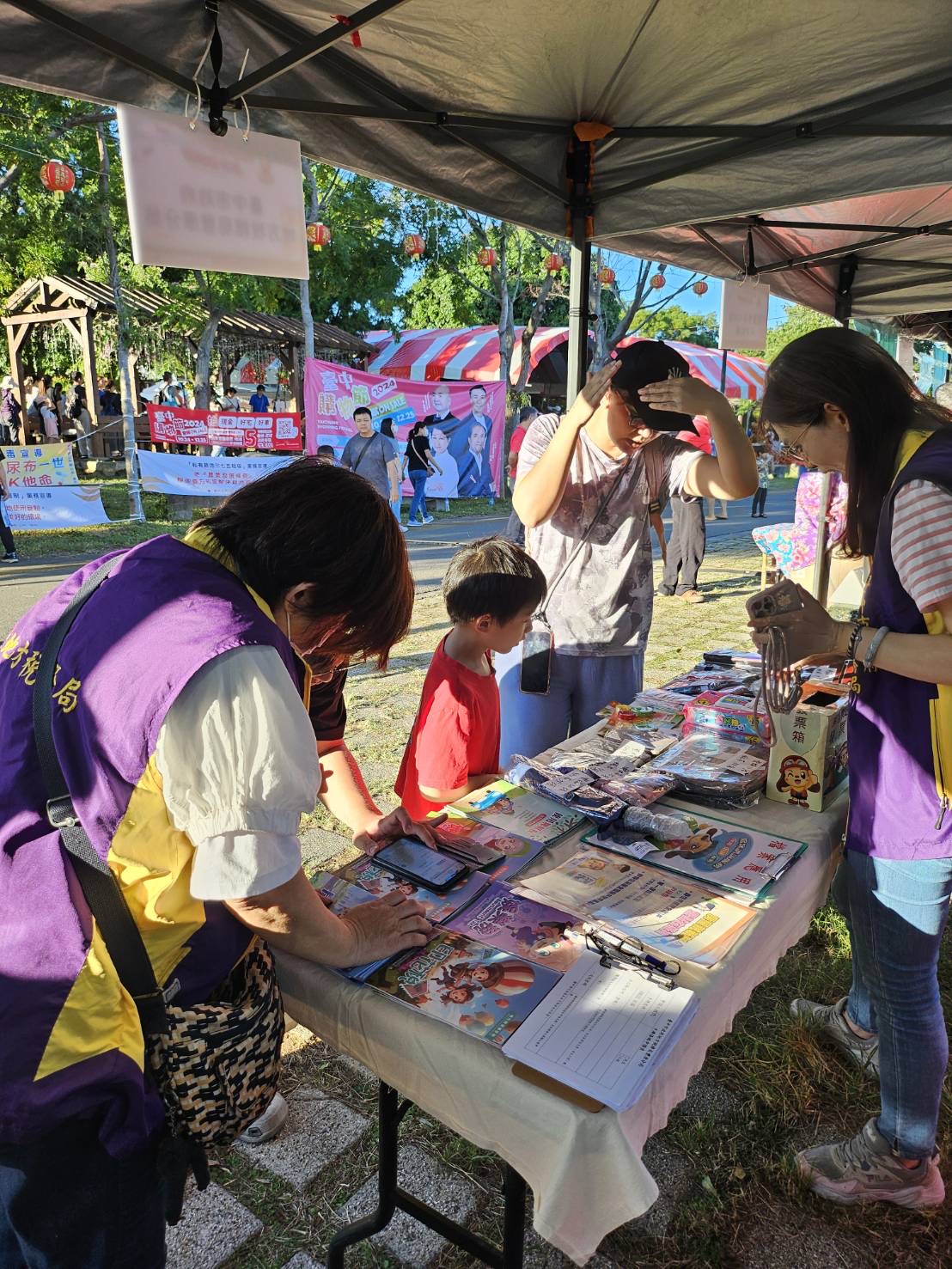 設置宣導服務台,懸掛布條宣傳納稅者權利保護法相關訊息及招募稅務志工海報,歡迎民眾報名加入工行列,並舉辦捐發票送愛心活動。