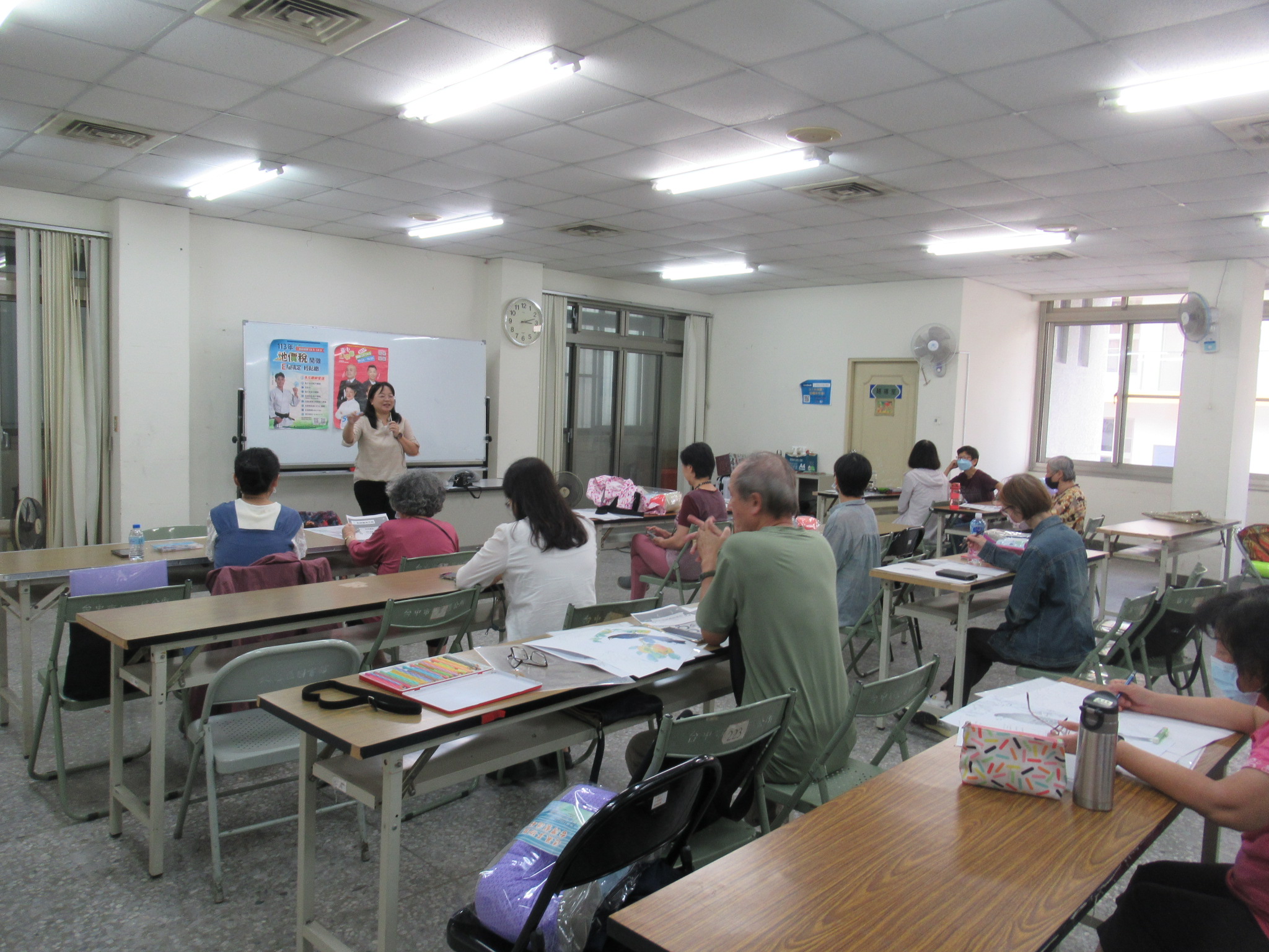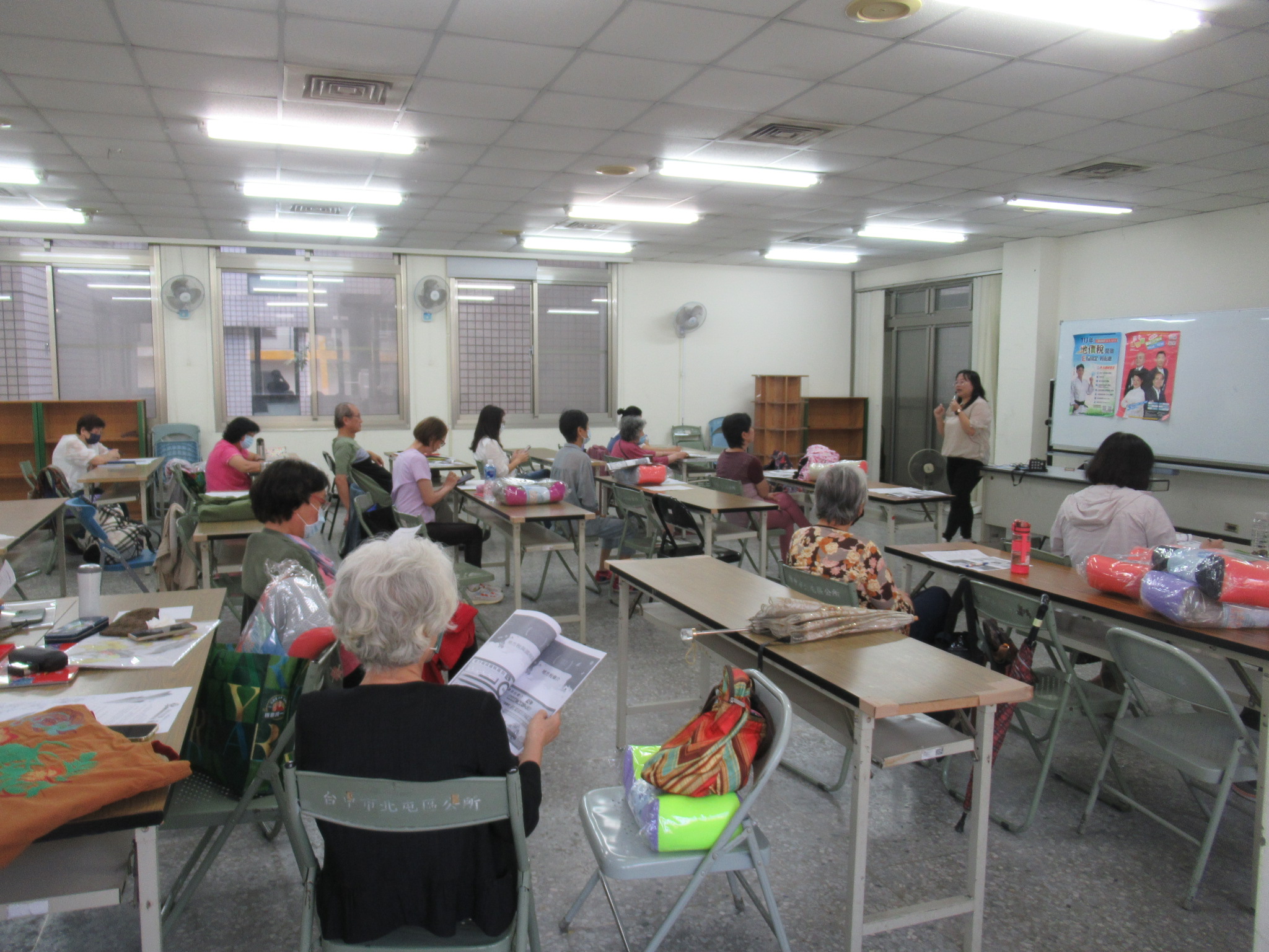 張貼房屋稅條例修正政策及臺中購物節文宣,並向學員推廣,擴大宣導效益。