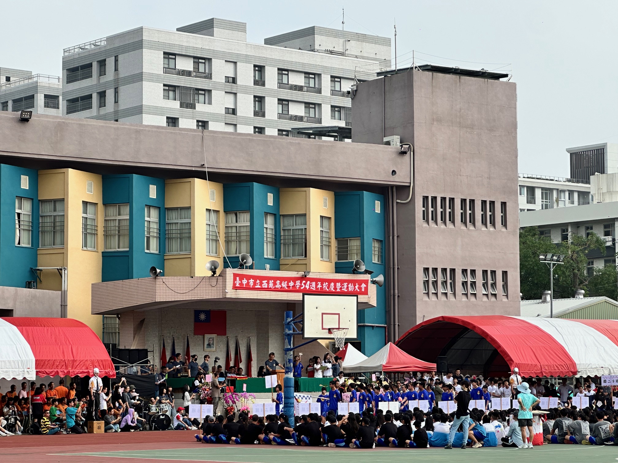 運動員進場囉!同學們穿著個性化的運動班服,整齊劃一地邁著步伐通過司令臺,接受師長的校閱及同學的歡呼。