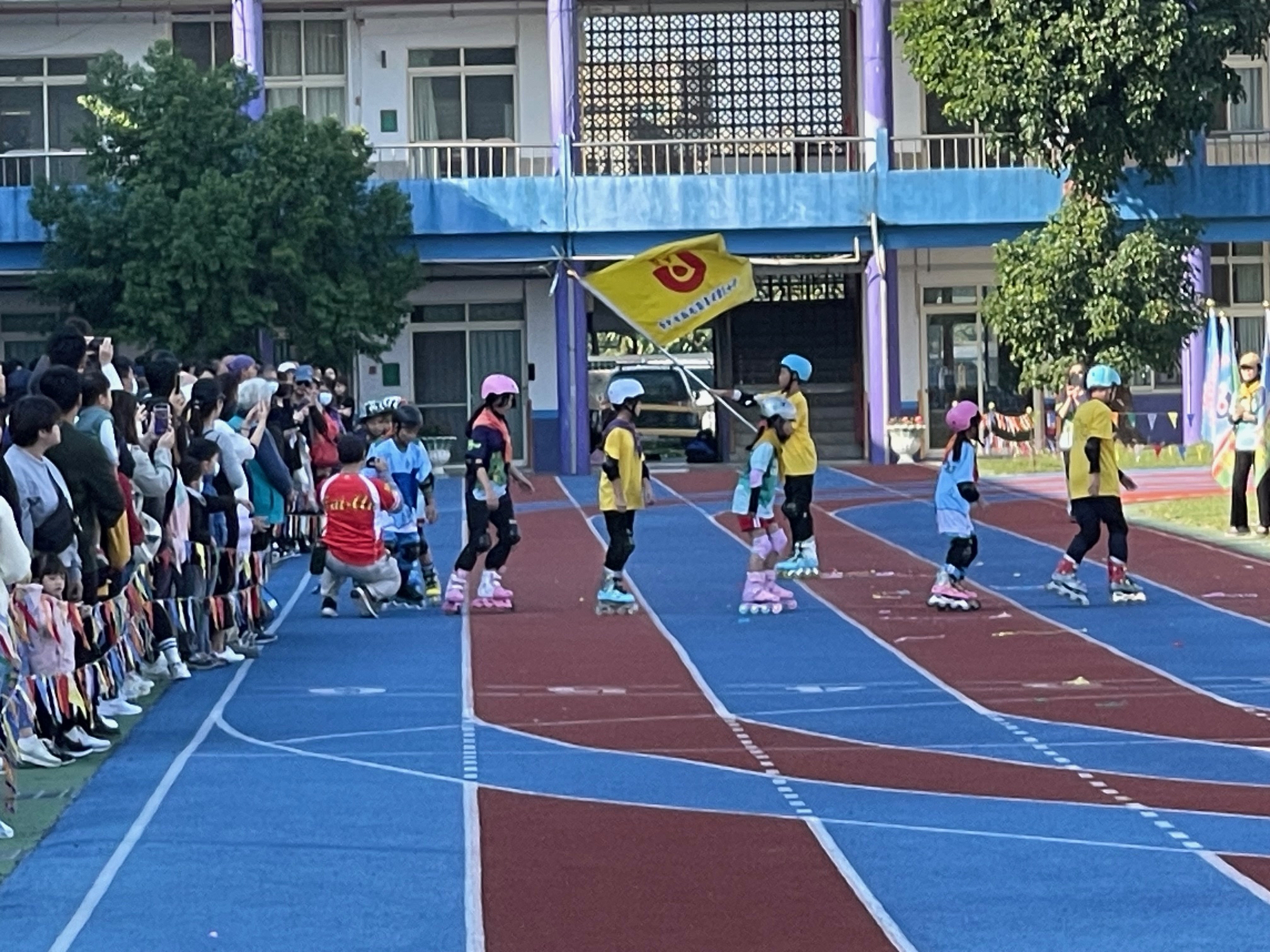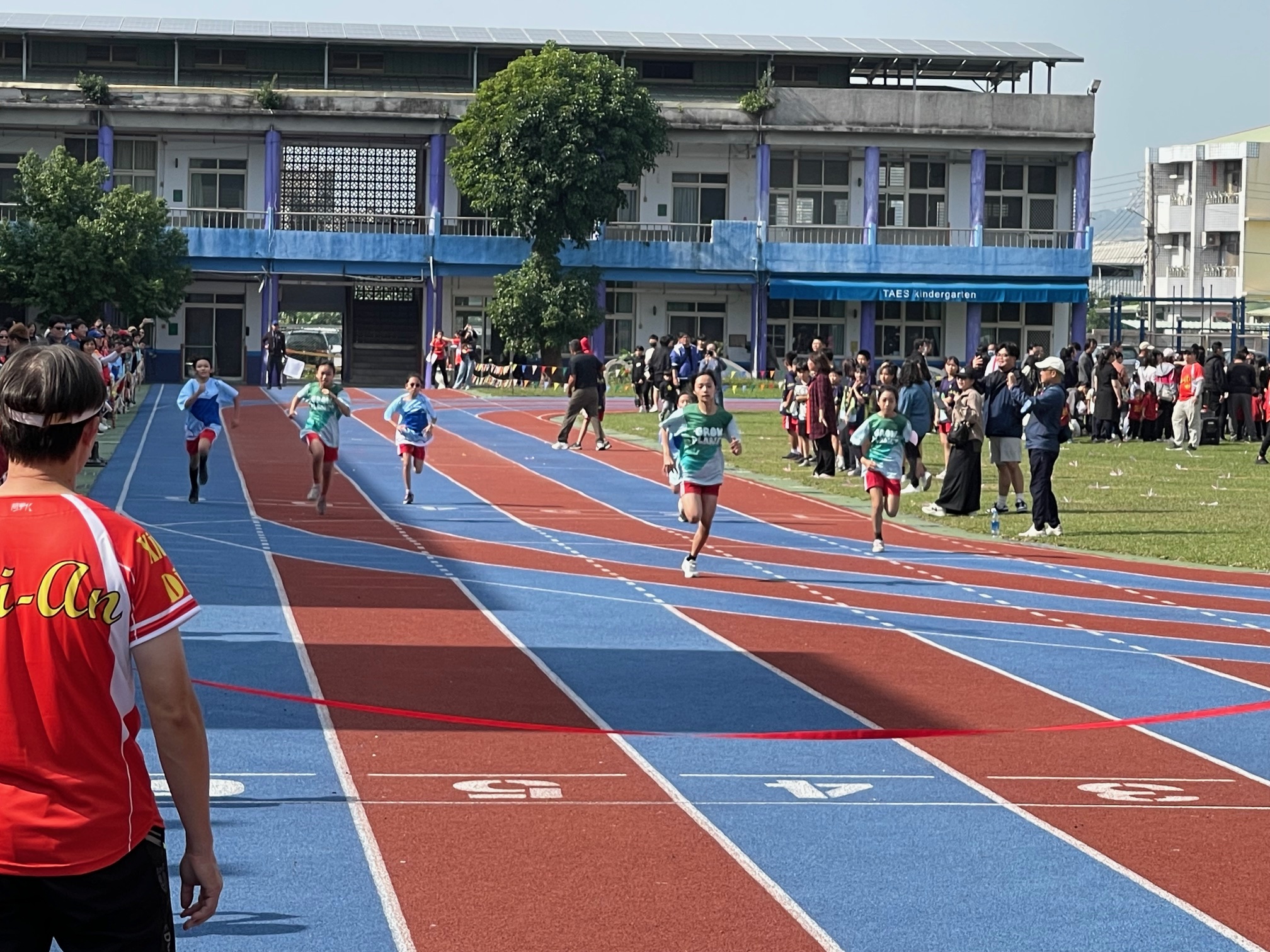 又到了緊張刺激的100公尺決賽,小朋友們奮力在賽道上奔跑,旁邊傳來親友及同學吶喊的加油聲,全力衝線爭取榮譽。