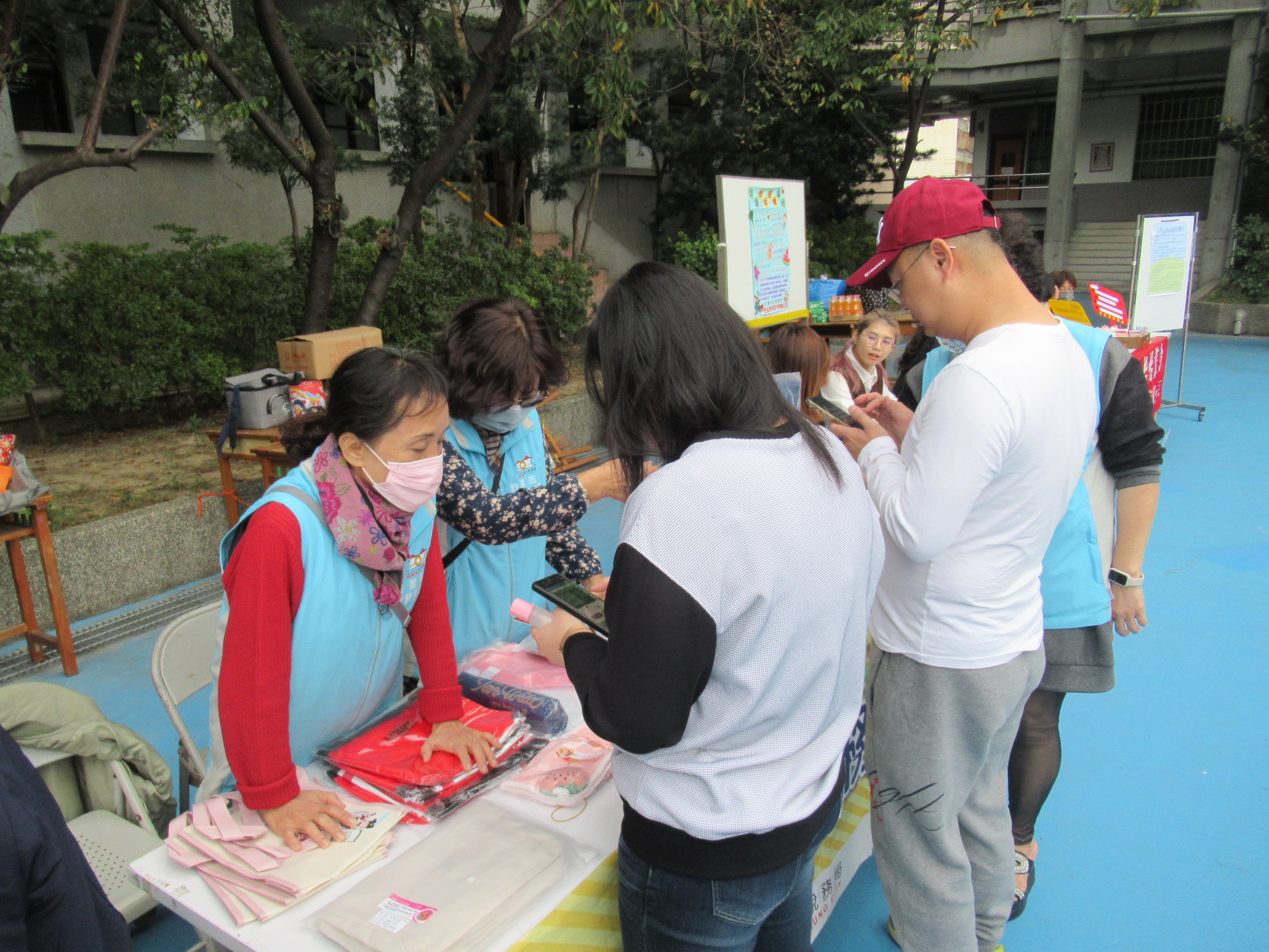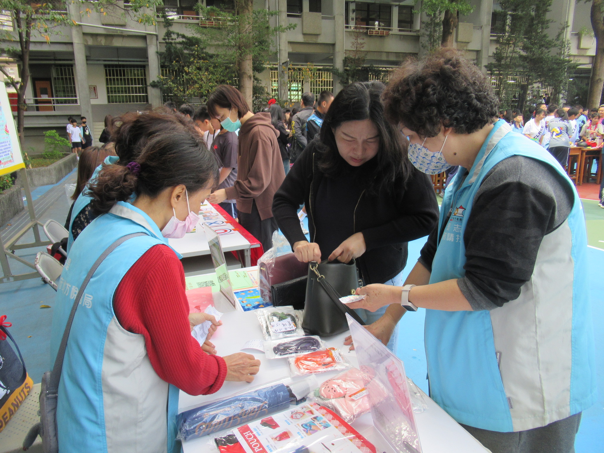 志工向老師推廣宣導品的種類眾多,提高民眾捐發票之意願。