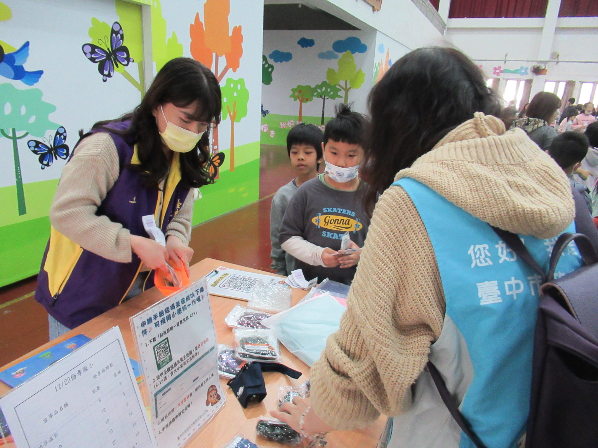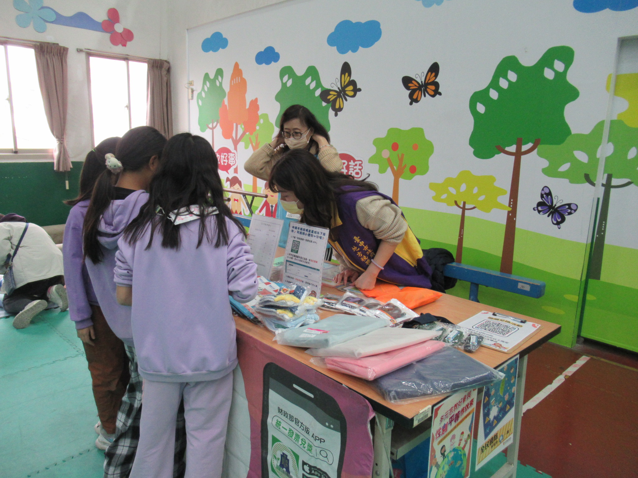 志工向小朋友說明宣導品有哪些,鼓勵捐贈發票做公益。