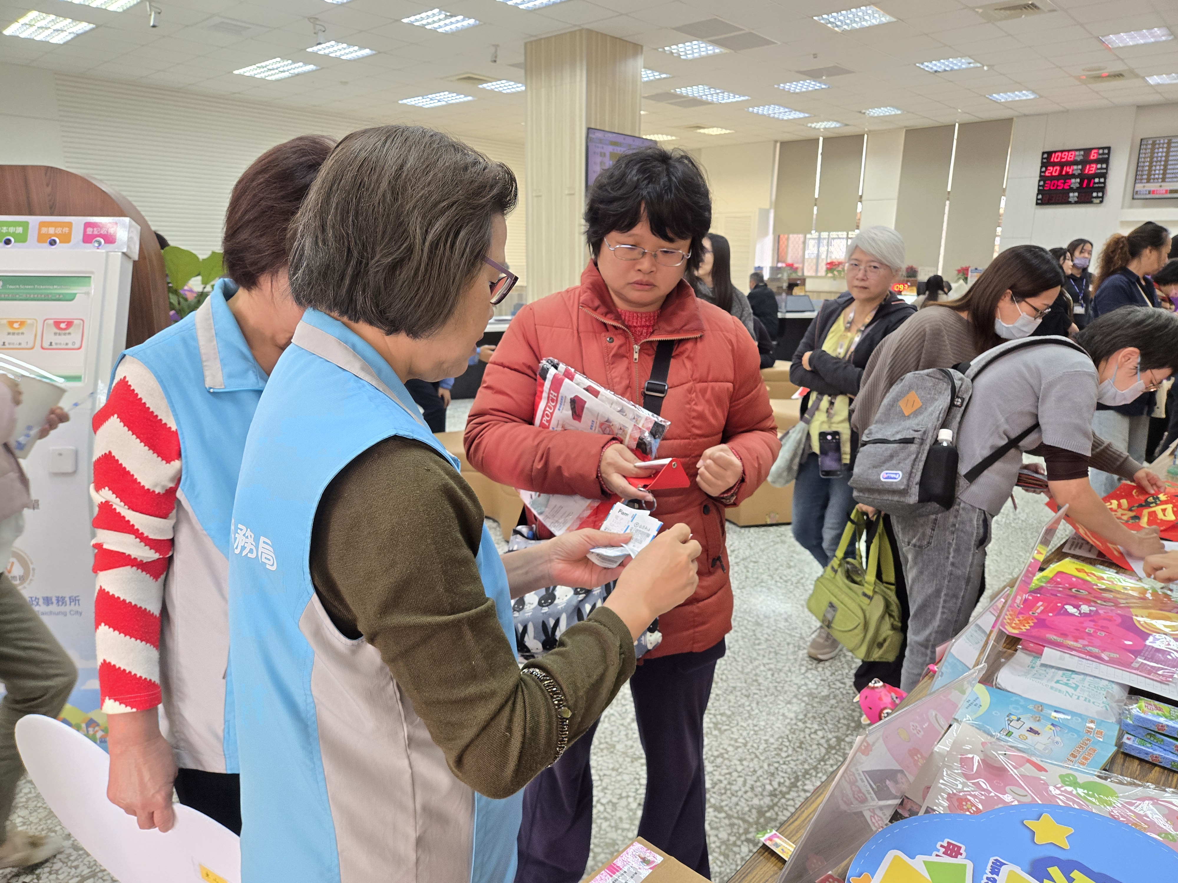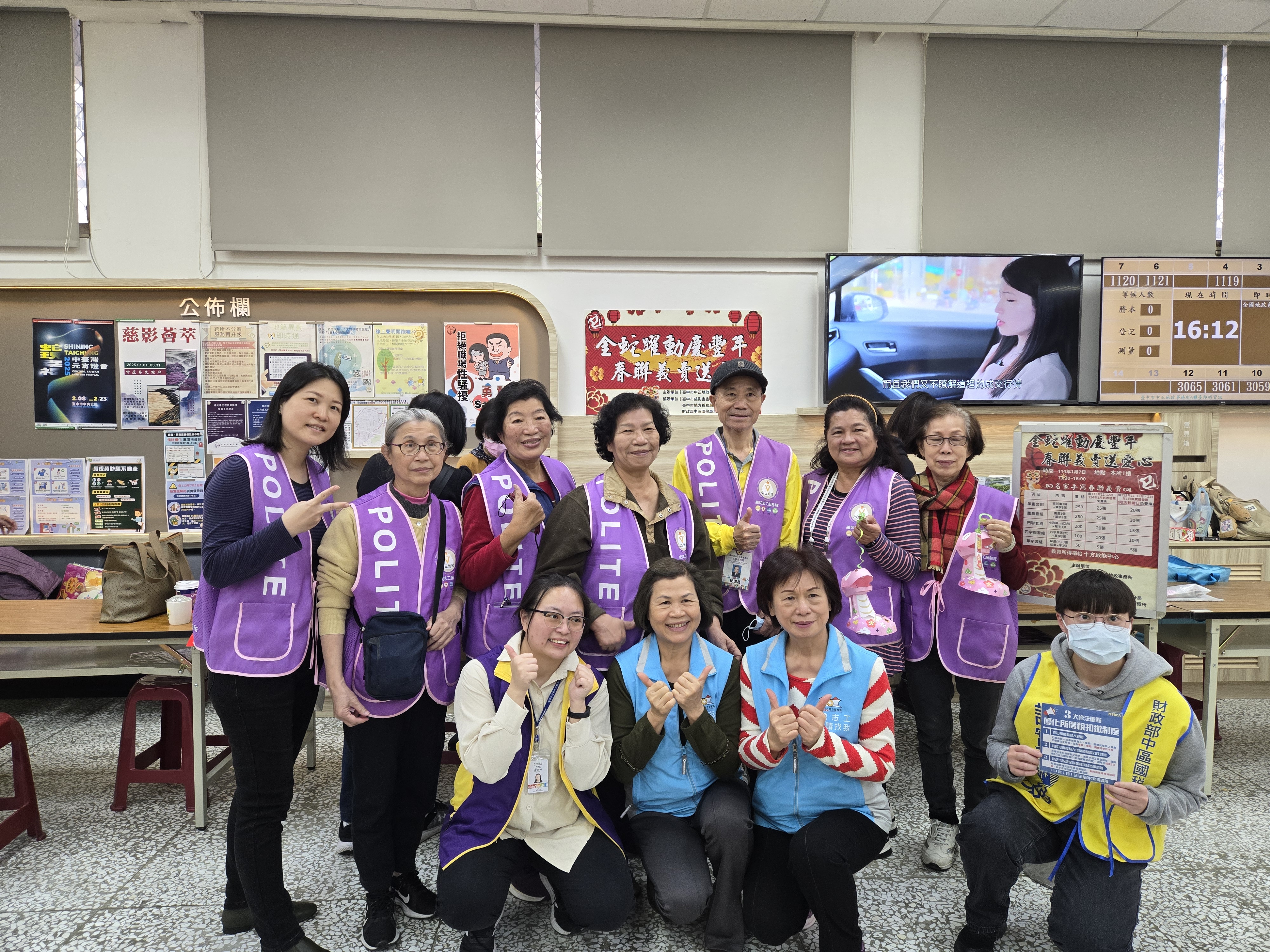 本分局志工與中正地政事務所志工跨機關志願服務,共同引導民眾參加春聯義賣活動。