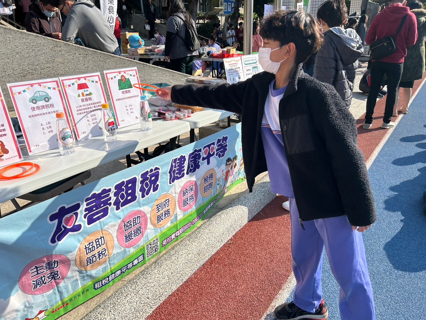 透過由套圈稅有趣闖關遊戲,宣導同仁向同學講解使用牌照稅的基本概念,在遊戲中學習租稅知識。