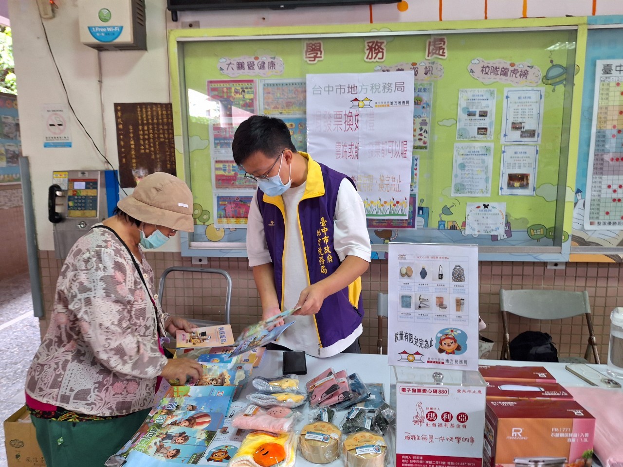 宣導攤位備有許多精美宣導品,捐發票作愛心就可以帶回家,民眾正仔細打量著贈品的細節,看看換甚麼贈品比較超值。