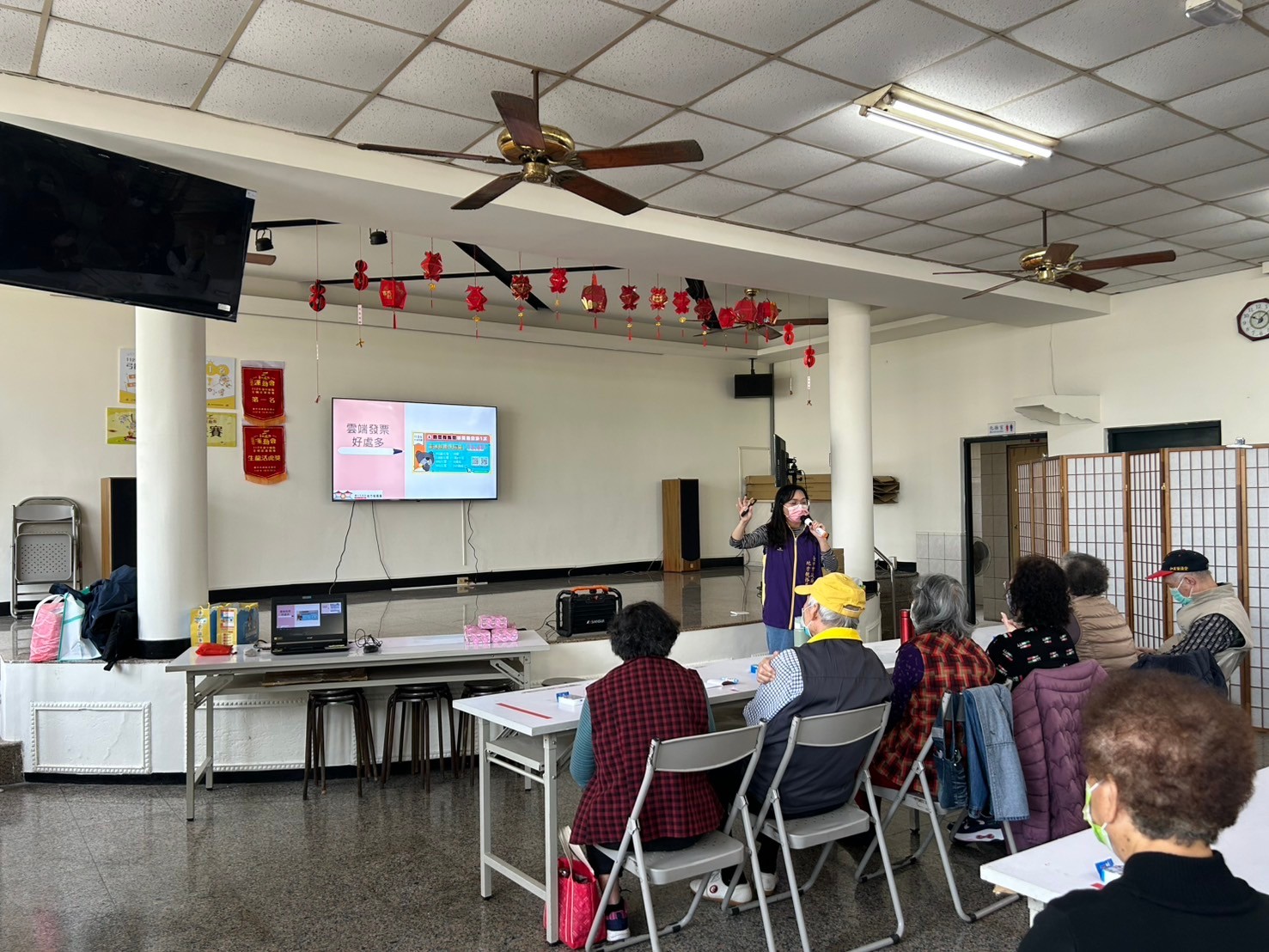 講師以淺顯易懂的方式講解使用雲端發票的好處,並鼓勵長輩及志工鼓勵民眾使用手機條碼及索取雲端發票,並協助下載統一發票兌獎APP。