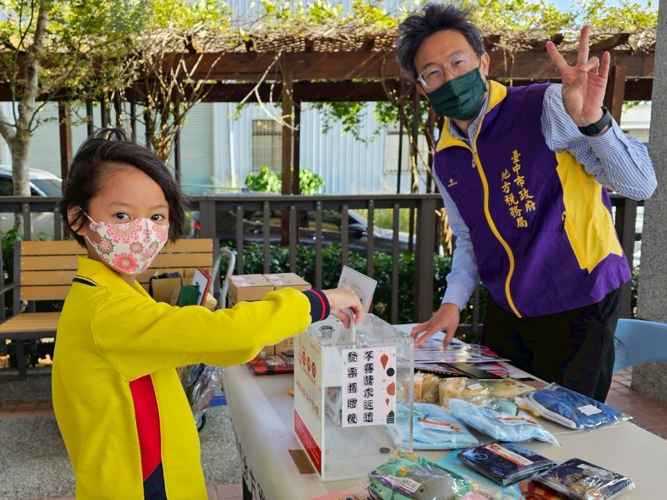 老師利用活動空檔來攤位兌換喜愛的折疊傘及不鏽鋼保鮮盒,收穫精美好禮也為弱勢團體貢獻心力。