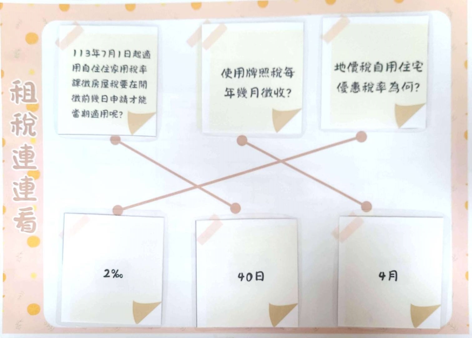 租稅連連看闖關遊戲,學童只需把正確答案放到相對應的位置即可闖關成功。