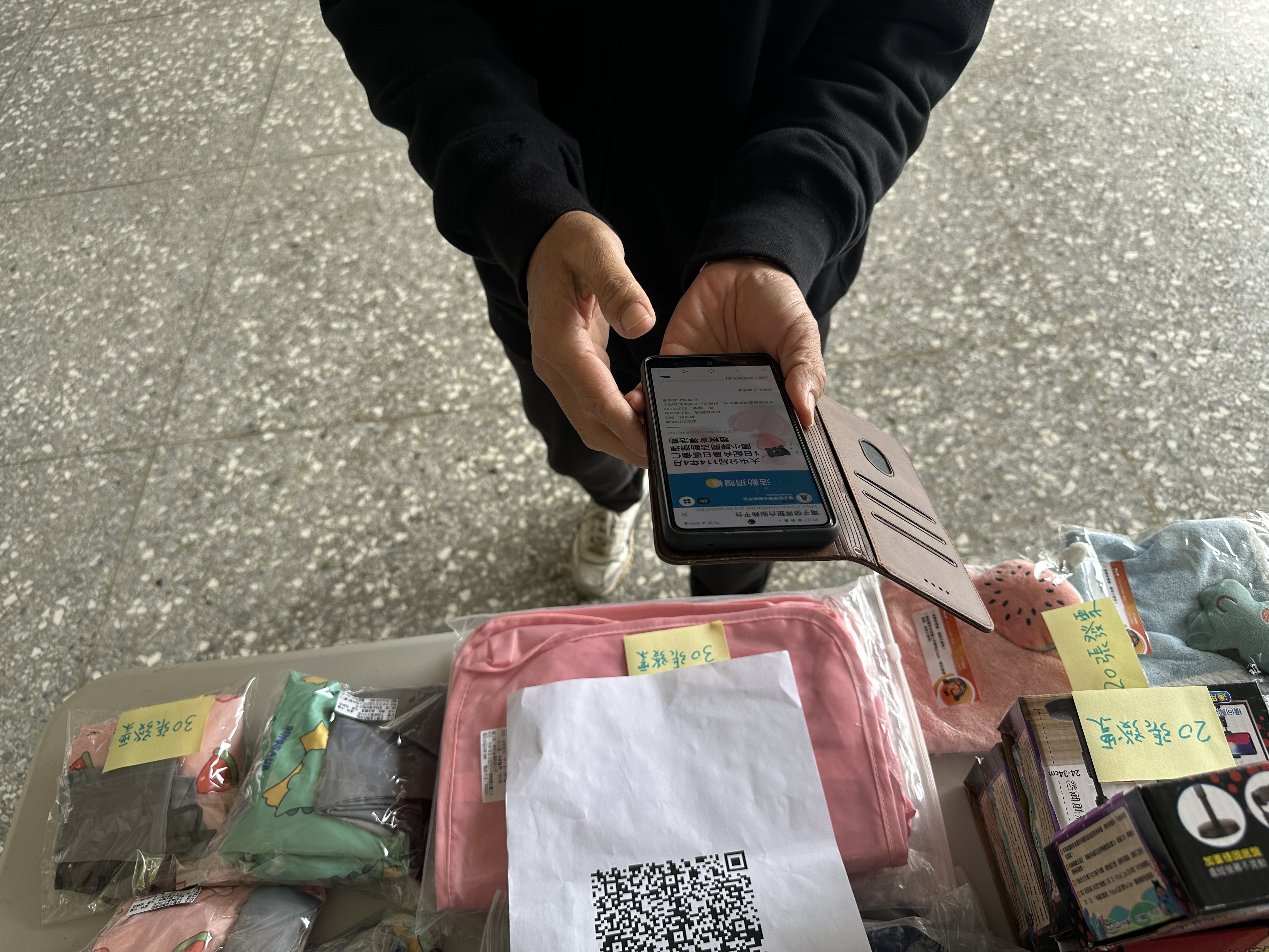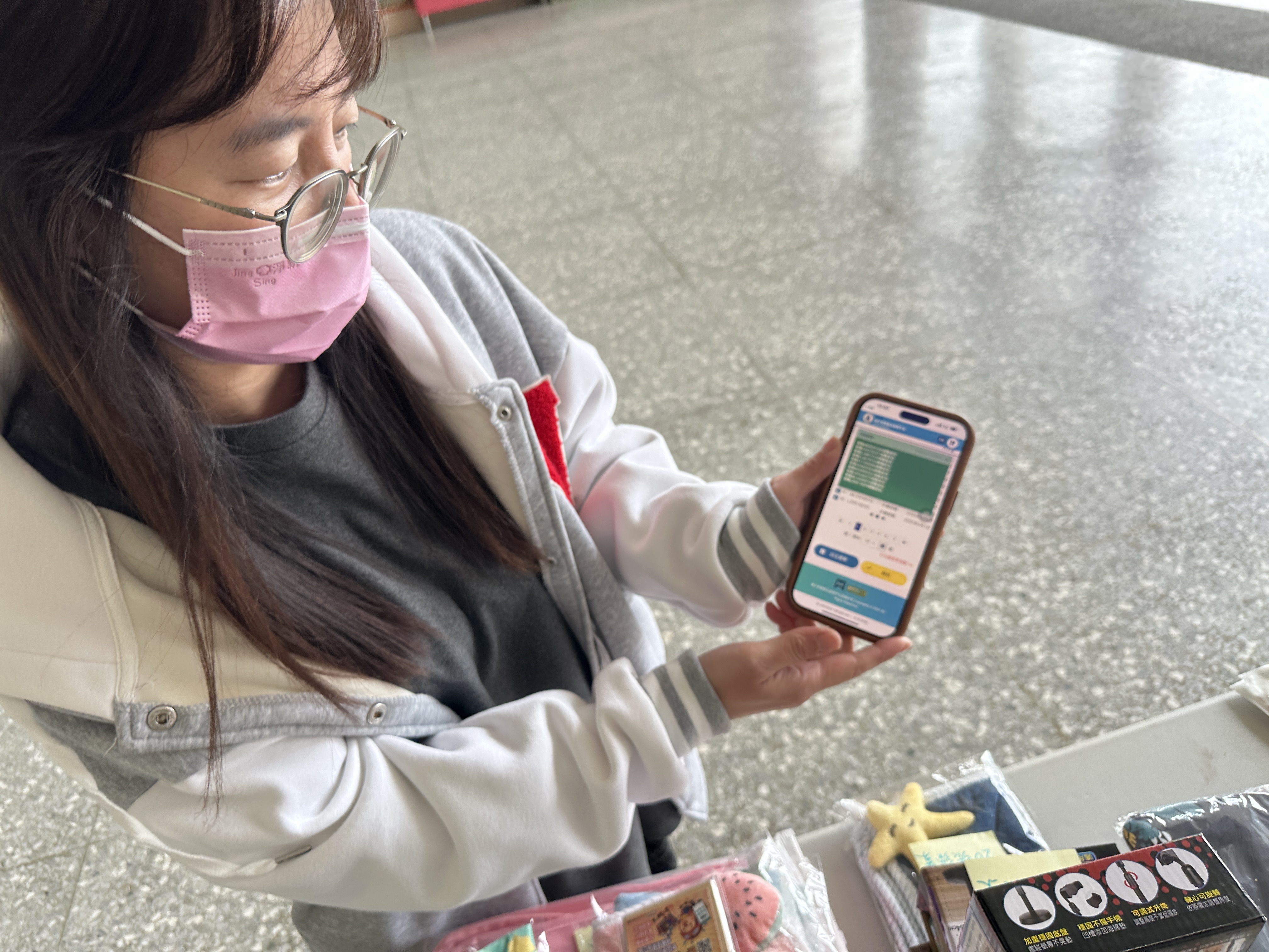 宣導品項豐富,同學們好奇駐足,工作人員向同學推廣發票存雲端之優點。