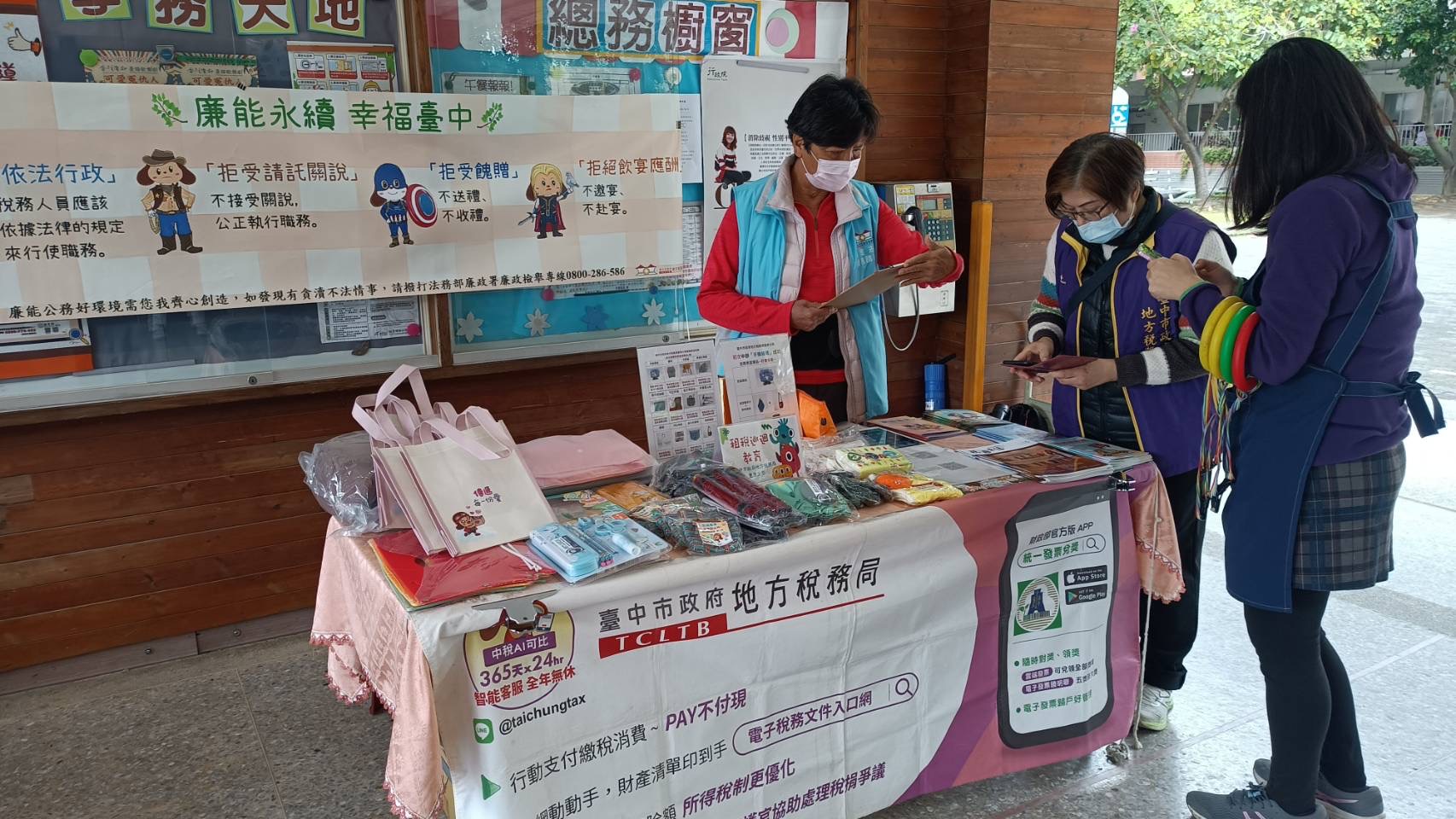 懸掛布條宣傳申請手機條碼及下載「統一發票兌獎」APP的便利性及「廉能永續 幸福臺中」之依法行政等重要法治觀念;張貼海報宣傳性平訊息。