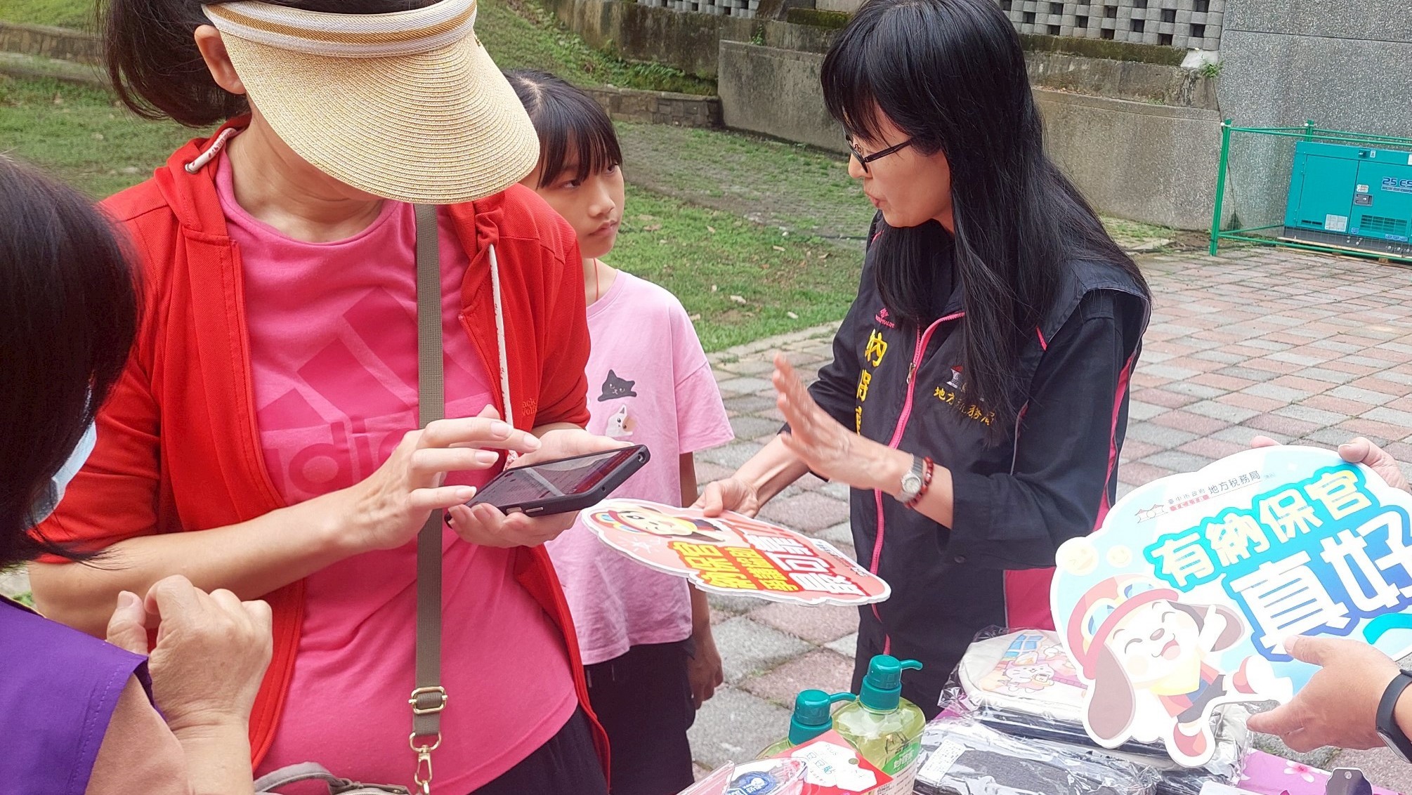 參訪的遊客在觀賞活動表演之餘,來到租稅宣導攤位下載實用的「統一發票兌獎APP」,並踴躍捐贈發票兌換精美實用的宣導品。