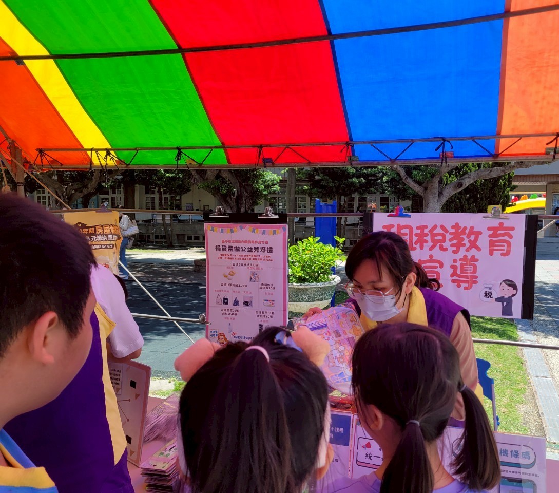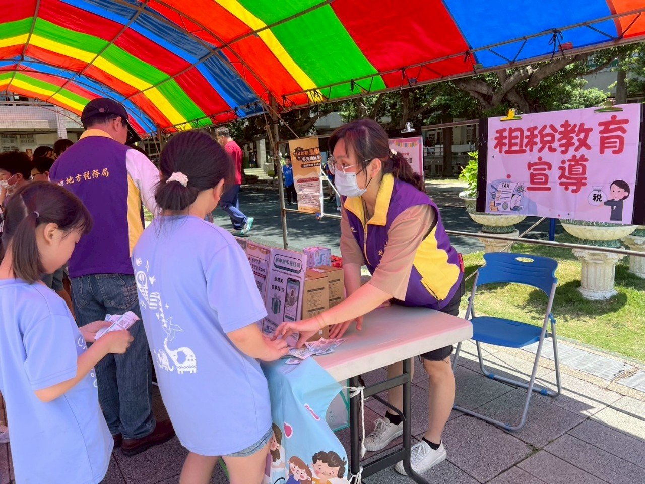 現場進行租稅連連看闖關遊戲,宣導同仁從中向同學介紹地方稅等相關租稅知識,闖關成功即可獲得精美小禮1份,吸引大朋友小朋友共同參與。
