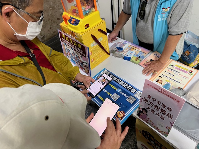 向民眾推廣加入本局FB「中市稅輕鬆」粉專、訂閱本局YT頻道觀看影片並觀看志工繪本,即可獲得精美小禮物一份。