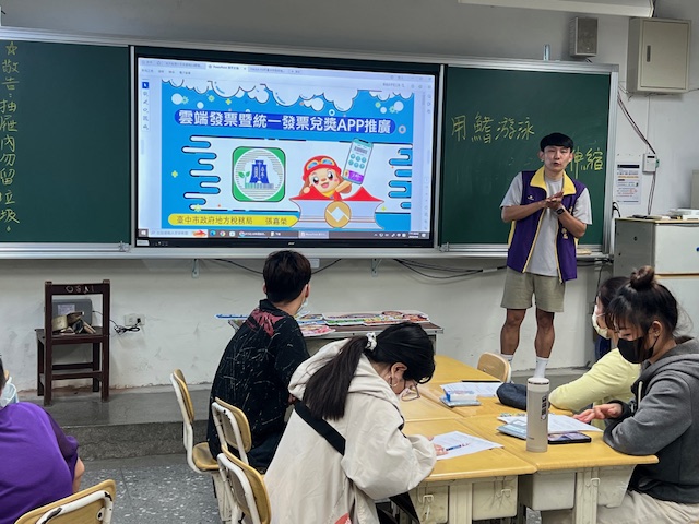 第二堂課講師介紹雲端發票之好處,並推廣統一發票兌獎APP。