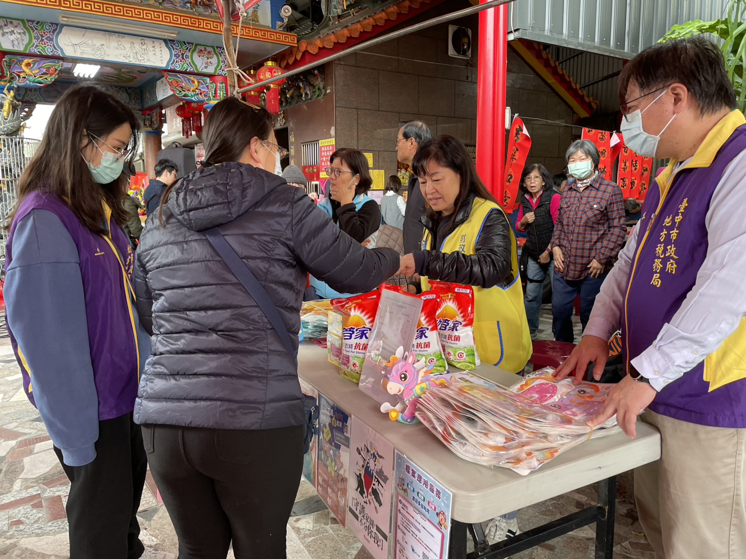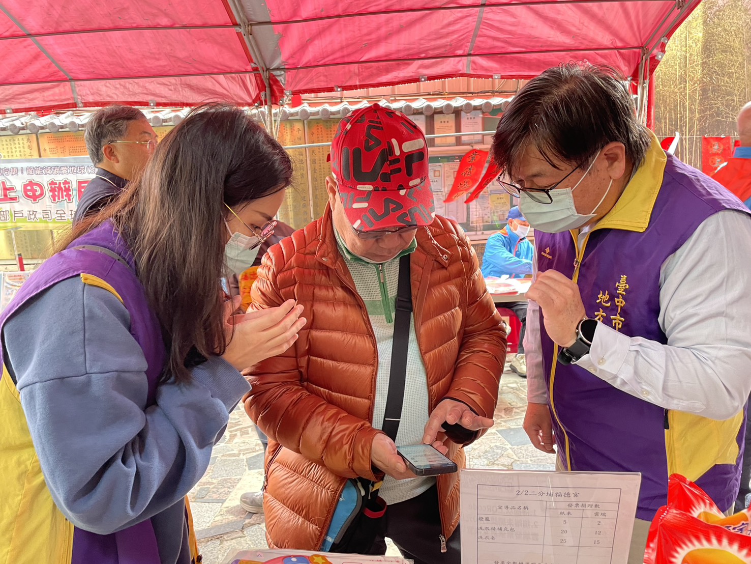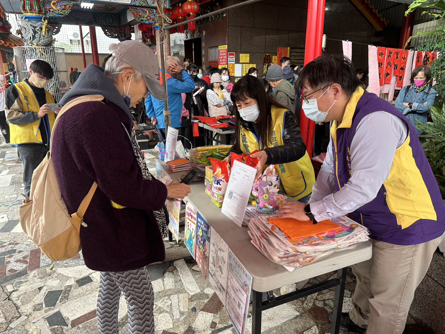 年節將至,志工協助民政捐贈發票兌換小提燈,氣氛熱絡。