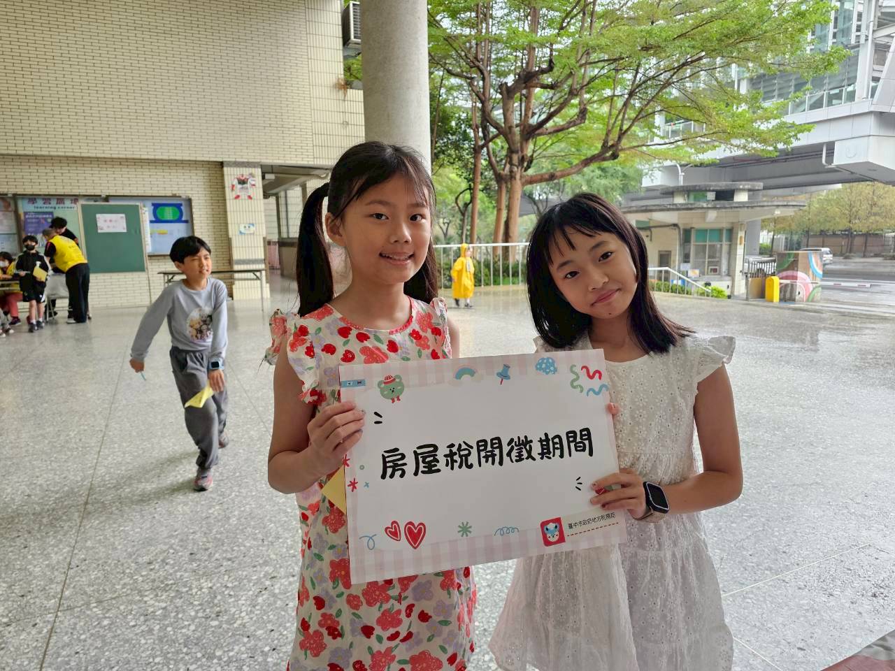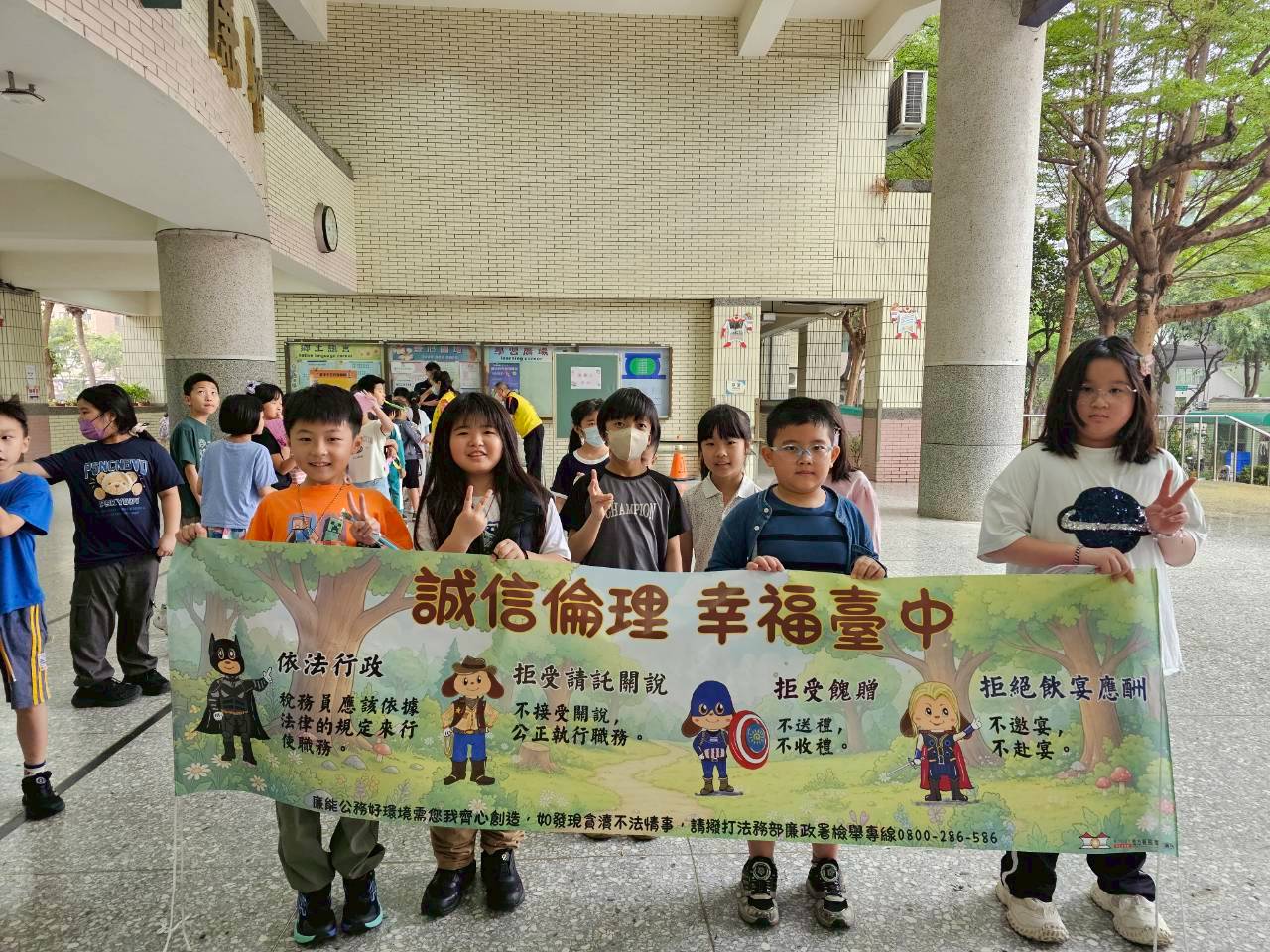 同學們一起響應「誠信倫理 幸福臺中」廉政宣導布條,讓孩子們從小建立正確價值觀。