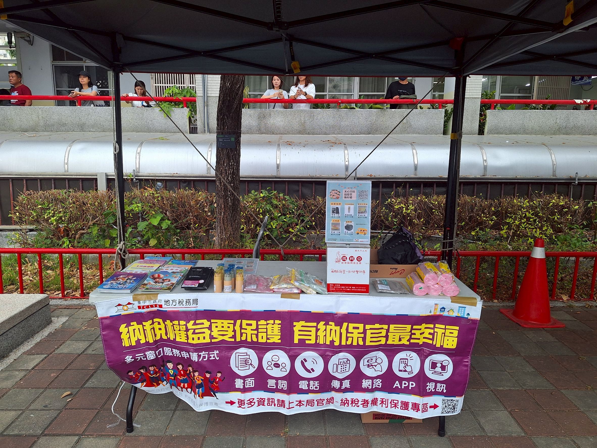 本分局也準備了琳瑯滿目的精美宣導品,並提供宣導折頁與租稅手冊供師生取閱,讓民眾在捐發票做公益的同時也能夠帶走一些日用品。