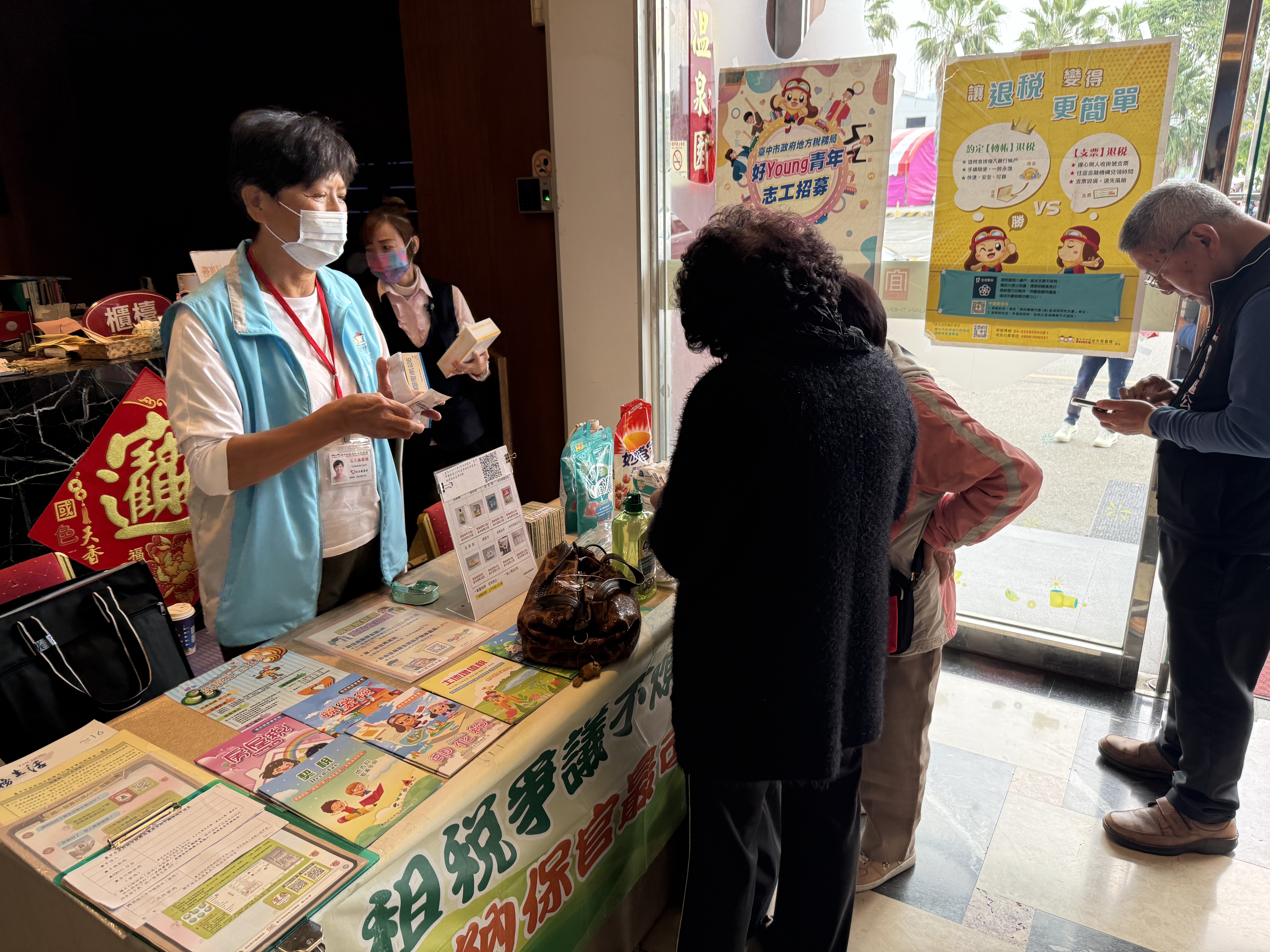 張貼海報宣傳納稅者權利保護法;工作人員服務民眾捐發票、送愛心、做公益及宣導下載使用「統一發票兌獎」APP訊息。