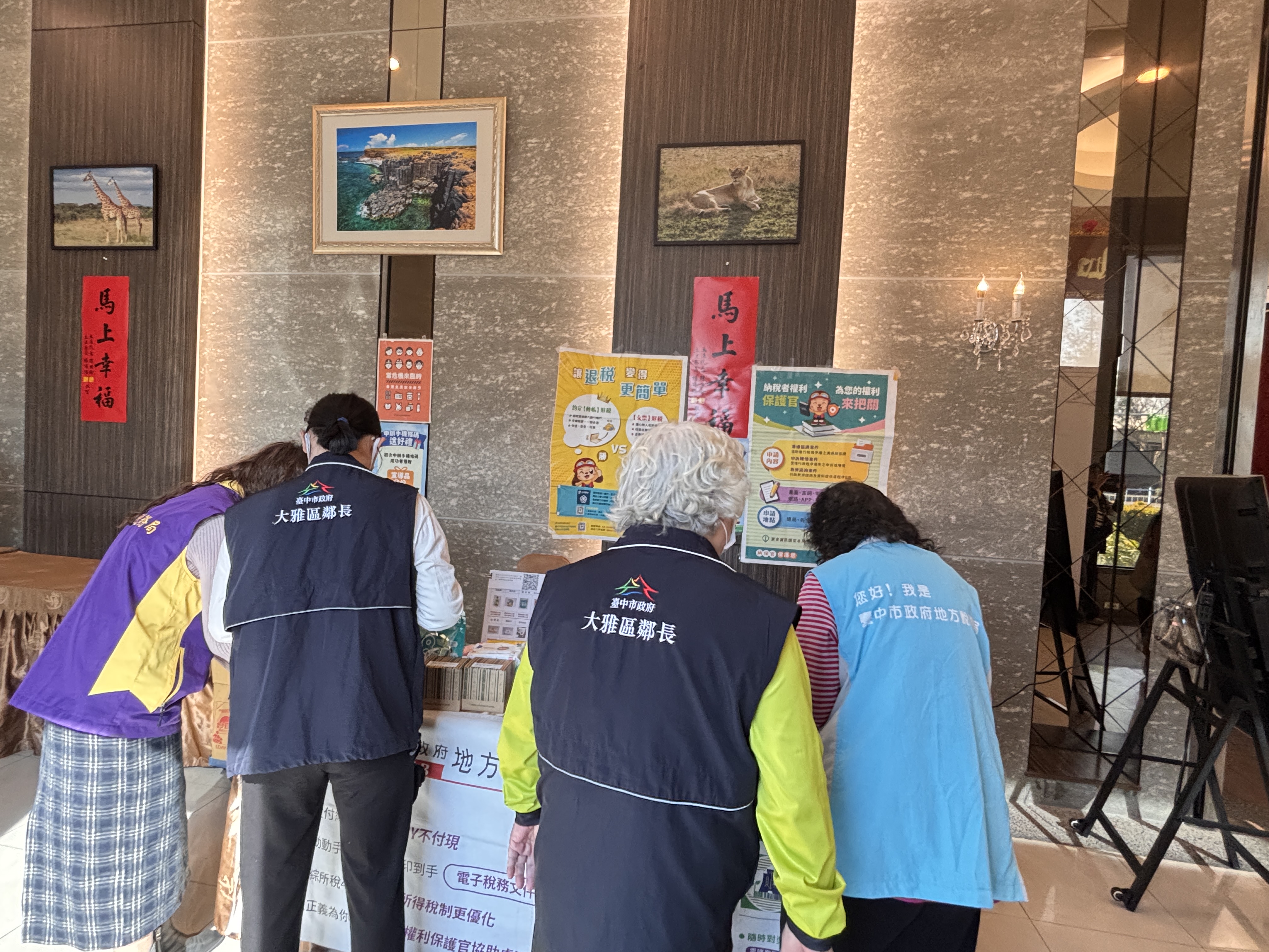 懸掛布條宣傳檔案應用管理資訊;張貼海報宣導納稅者權益保護法、直撥退稅及全民安全指引等訊息,並分送地方稅各稅宣導資料,還有捐發票送好禮等好康活動。