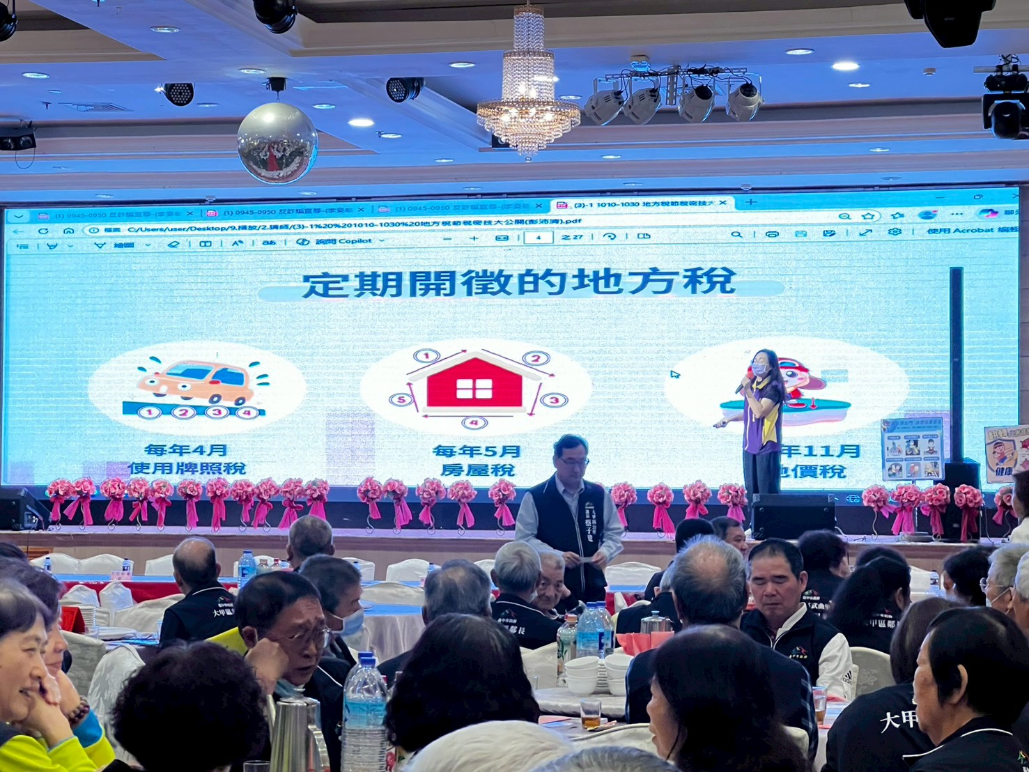 講師向里鄰長說明定期課徵的地方稅為使用牌照稅、房屋稅、地價稅及開徵期間。