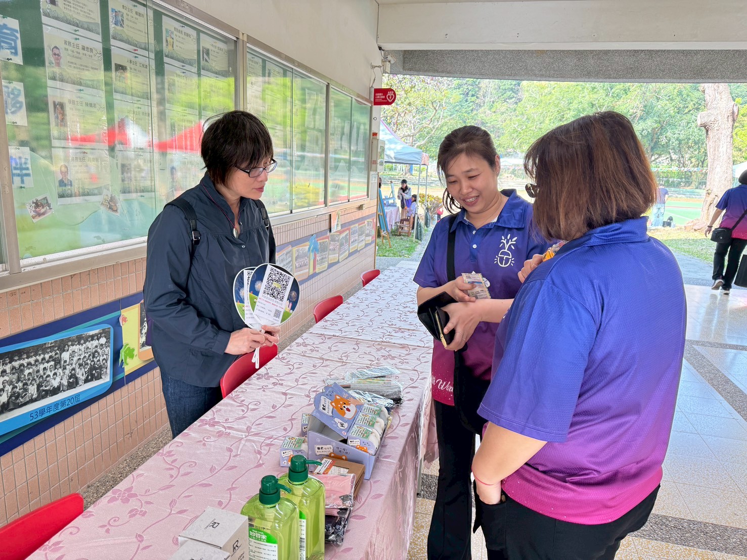 工作夥伴向學生及家長推廣下載實用的「統一發票兌獎APP」,並踴躍捐贈發票兌換精美實用的宣導品。