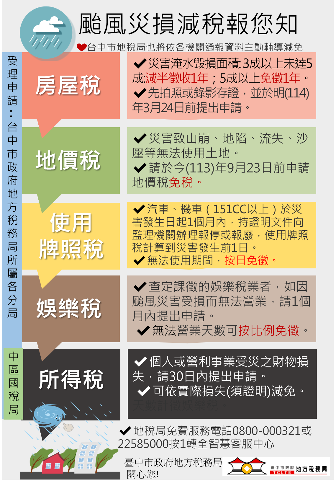 (台中訊) 今年第3號颱風「凱米」侵台機率高,依據中央氣象署的天氣預報,可能本(7)月24日(週三)就會發布海上颱風警報,25日(週四)可能登陸。以往颱風來襲都會帶給中部地區大量的雨水,如果風勢強勁,更可能發生房屋毀損的災情。台中市政府地方稅務局提醒民眾,除了事先做好防災準備,萬一發生災情,地稅局將主動蒐集資料,也提醒民眾可以在災害發生日起1個月內申請減免使用牌照稅及娛樂稅,9月22日前可申請減免地價稅,明年3月24日前可申請減免房屋稅。